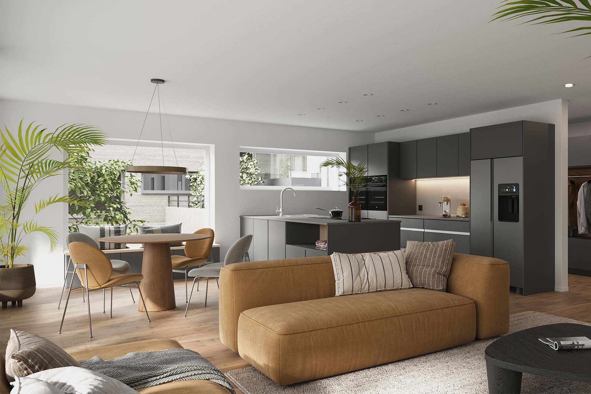Bilder und Fotos sind Visualisierungen gemäss aktuellem Projektstand. Änderungen vorbehalten. Situationen und Einrichtungsvorschläge sind typähnlich (unverbindlich). Das gezeigte Mobiliar ist nicht Teil des Kaufpreises.